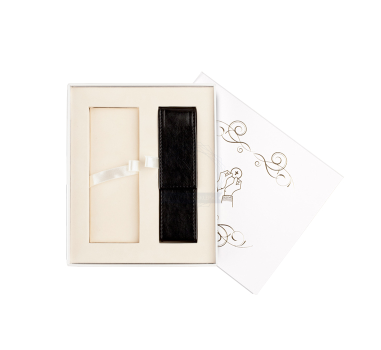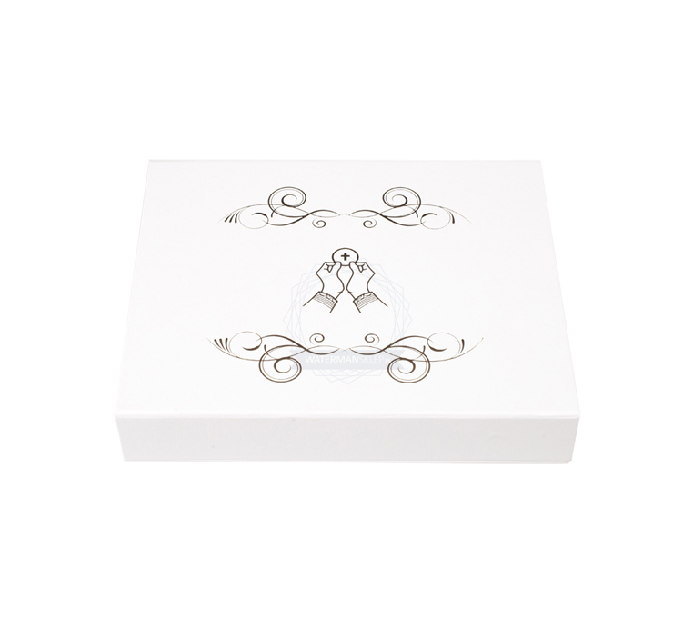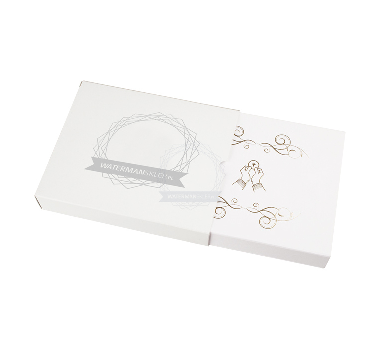 Tłoczone pamiątkowym, komunijnym wzorem na powierzchni. Na grzbiecie pudełka napis: "Pamiątka Komunii Świętej". Pudełko zawiera stylowe etui wykonane z czarnej ekoskóry przeznaczone na dwa produkty. Wyściełane miłym w dotyku materiałem, posiada atłasowe prezentowe tasiemki.