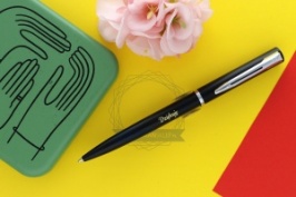 Długopis pokryty jest gustownym czarnym, matowym lakierem. Klips i pierścień wykonano ze stali nierdzewnej i pokryto błyszczącym chromem. Posiada wciskany mechanizm wysuwania wkładu (naciskamy całą skuwkę)
