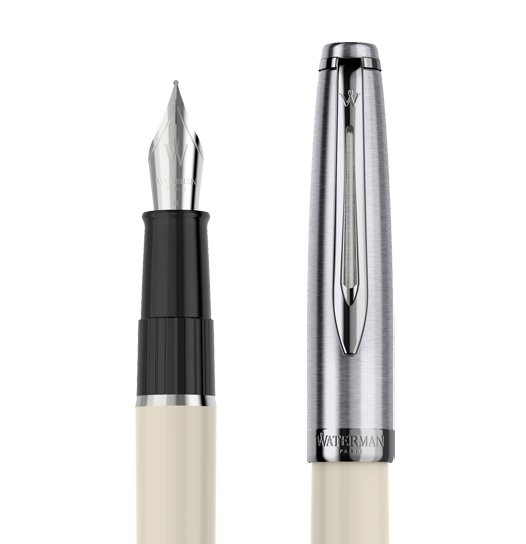 Pióro wieczne Embleme doskonale trzyma się w dłoni. Skuwka wykonana jest ze stali nierdzewnej, szyku dodaje mu szczotkowanie w poprzek skuwki. Wykończenia chromowane. Korpus z żywicy premium w kolorze ecru.