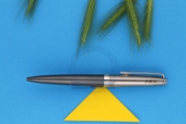Długopis Embleme doskonale trzyma się w dłoni. Skuwka wykonana jest ze stali nierdzewnej, szyku dodaje mu szczotkowanie w poprzek skuwki. Wykończenia chromowane. Korpus z żywicy premium w kolorze metalicznej szarości.