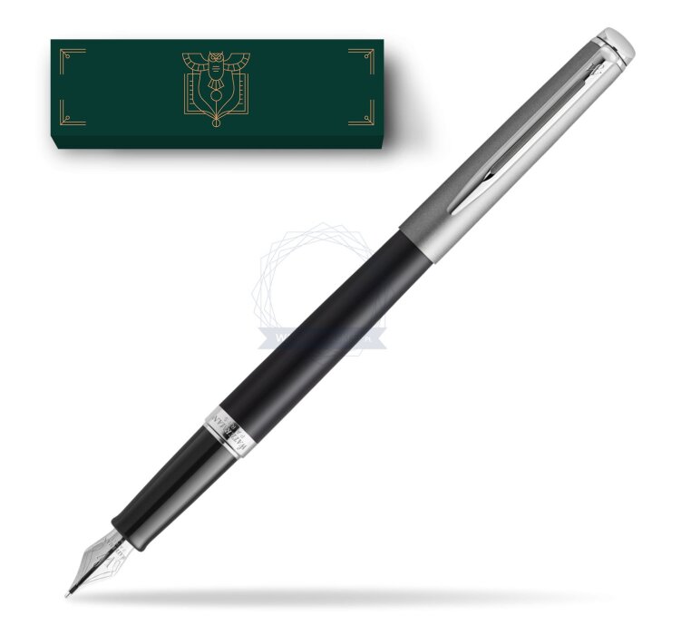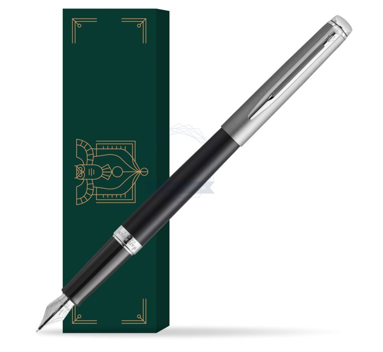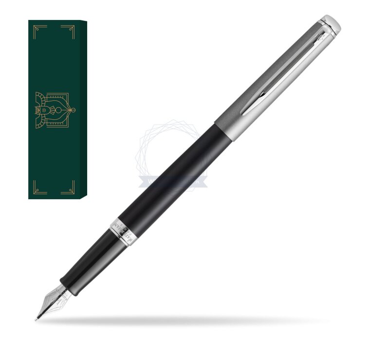 Waterman Hémisphère pióro wieczne, stal szlachetna i matowy czarny lakier z chromowanym wykończeniem, stalówka z nabojem z atramentem, pudełko upominkowe.