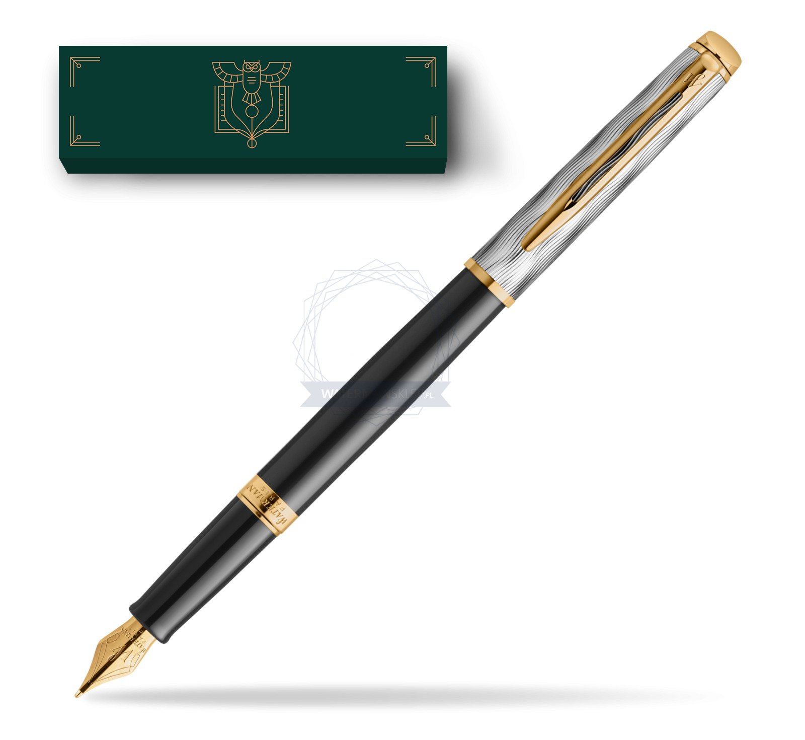 Czarny lakierowany korpus i pozłacane wykończenia modelu Waterman Hémisphère oddają romantyczny nastrój paryskiego nocnego nieba nad skąpanymi w złotym blasku kawiarniami i miejskimi latarniami, natomiast wyrafinowana, powlekana palladem nasadka z cyzelowanym wzorem fal nawiązuje do spokojnego nurtu Sekwany. Pozłacana stalówka pióra wiecznego ze stali szlachetnej dopełnia klasyczne elementy Waterman takie jak charakterystyczny klips na nasadce i zapętlone „W”. Każde pióro jest skrupulatnie ręcznie składane we Francji, prezentując galijski savoir-faire Watermana.