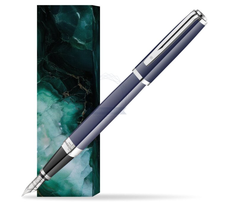 Znakomicie zaprojektowane pióro wieczne Exception o charakterystycznym kwadratowym kształcie to prawdziwe osiągnięcie wiedzy technicznej. Model ten dostępny jest w charakterystycznym dla marki Waterman odcieniu głębokiego błękitu. To charakterystyczne wykończenie lakieru zarówno na skuwce, jak i korpusie doskonale łączy się z wyjątkowym kunsztem Waterman oraz elegancką paryską stylistyką, aby tworzyć efekt będący esencją wyrafinowania. Idealnie dopełnia je pokryty palladem dwudzielny klips i wykończenia oraz czarna obudowa z żywicy, które razem emanują duchem marki Waterman. To pióro premium idealnie równoważy w sobie łatwość pisania z pełnym pewności siebie paryskim szykiem. Każde luksusowe pióro wytworzone we Francji jest elegancko zapakowane w pudełko upominkowe Waterman.