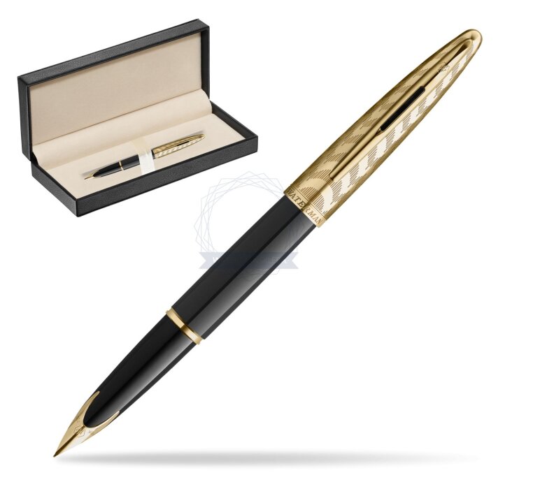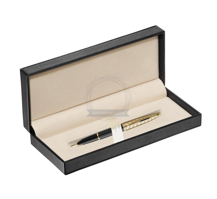 Stalówka: zabudowana stalówka z 18-karatowego złota uzupełniona jest o klasyczne elementy Waterman, takie jak ikoniczny grawer Waterman ze wzorem sześciokąta. Na stalówce oznaczenie próby jubulerskiej.