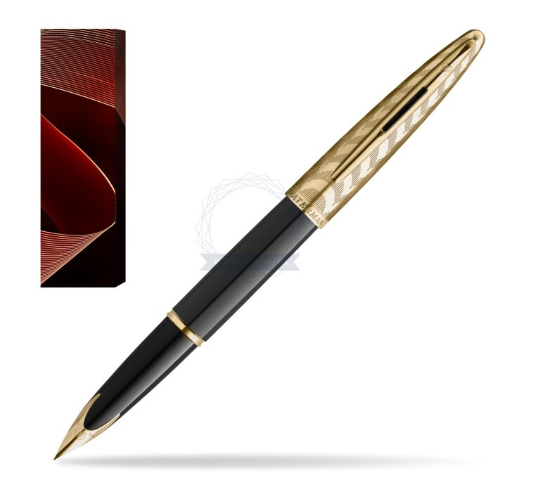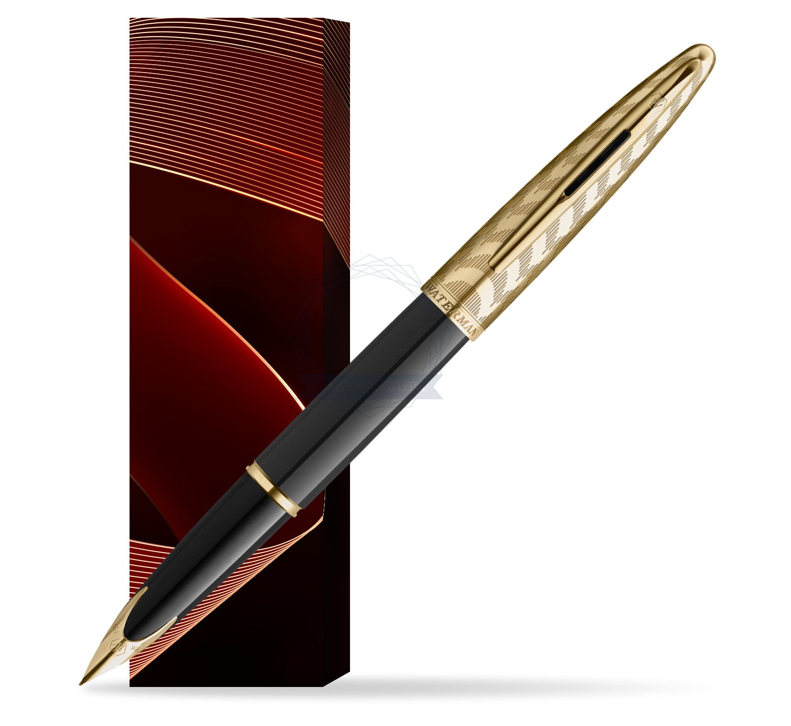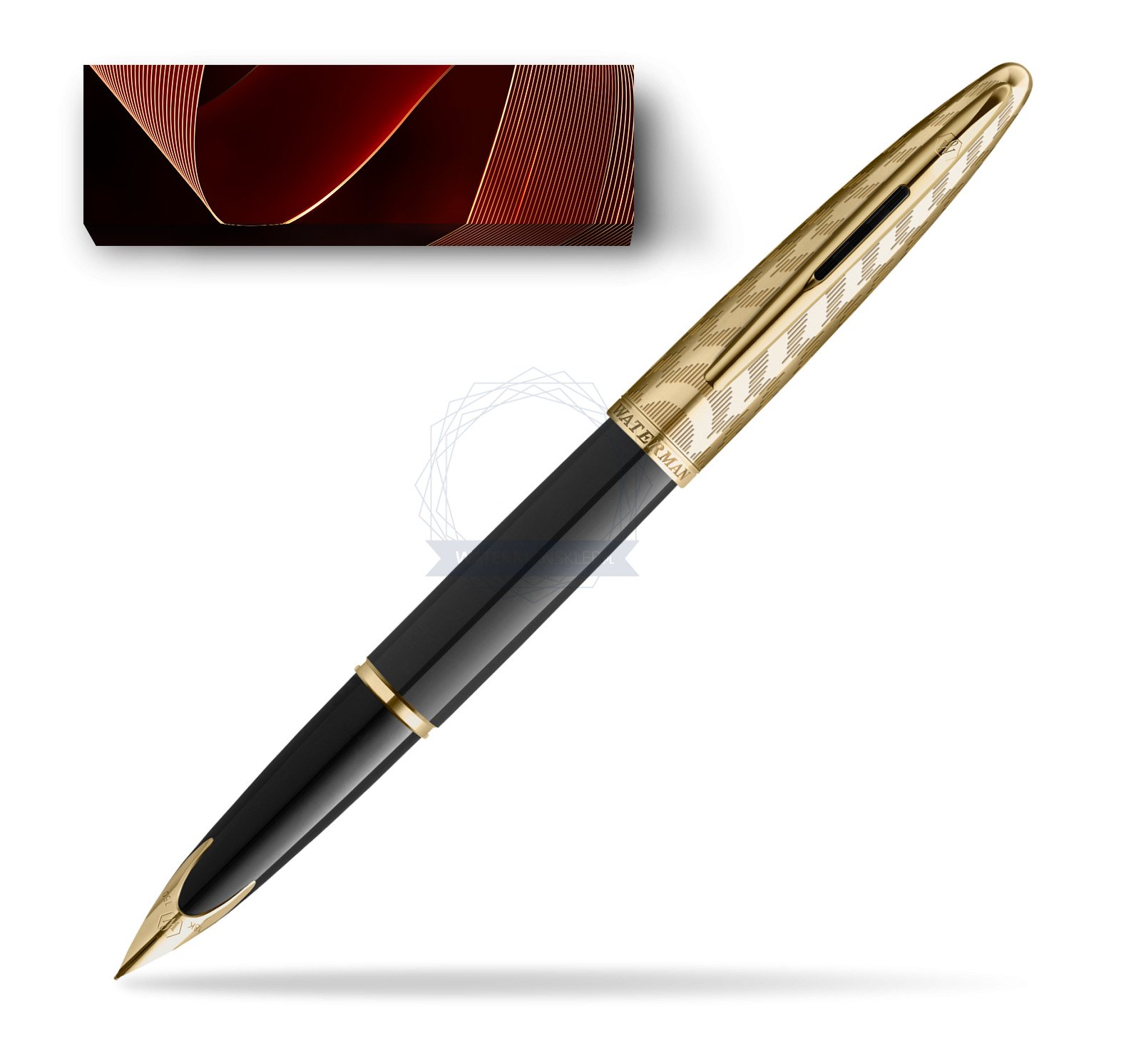 Stalówka: zabudowana stalówka z 18-karatowego złota uzupełniona jest o klasyczne elementy Waterman, takie jak ikoniczny grawer Waterman ze wzorem sześciokąta. Na stalówce oznaczenie próby jubulerskiej.