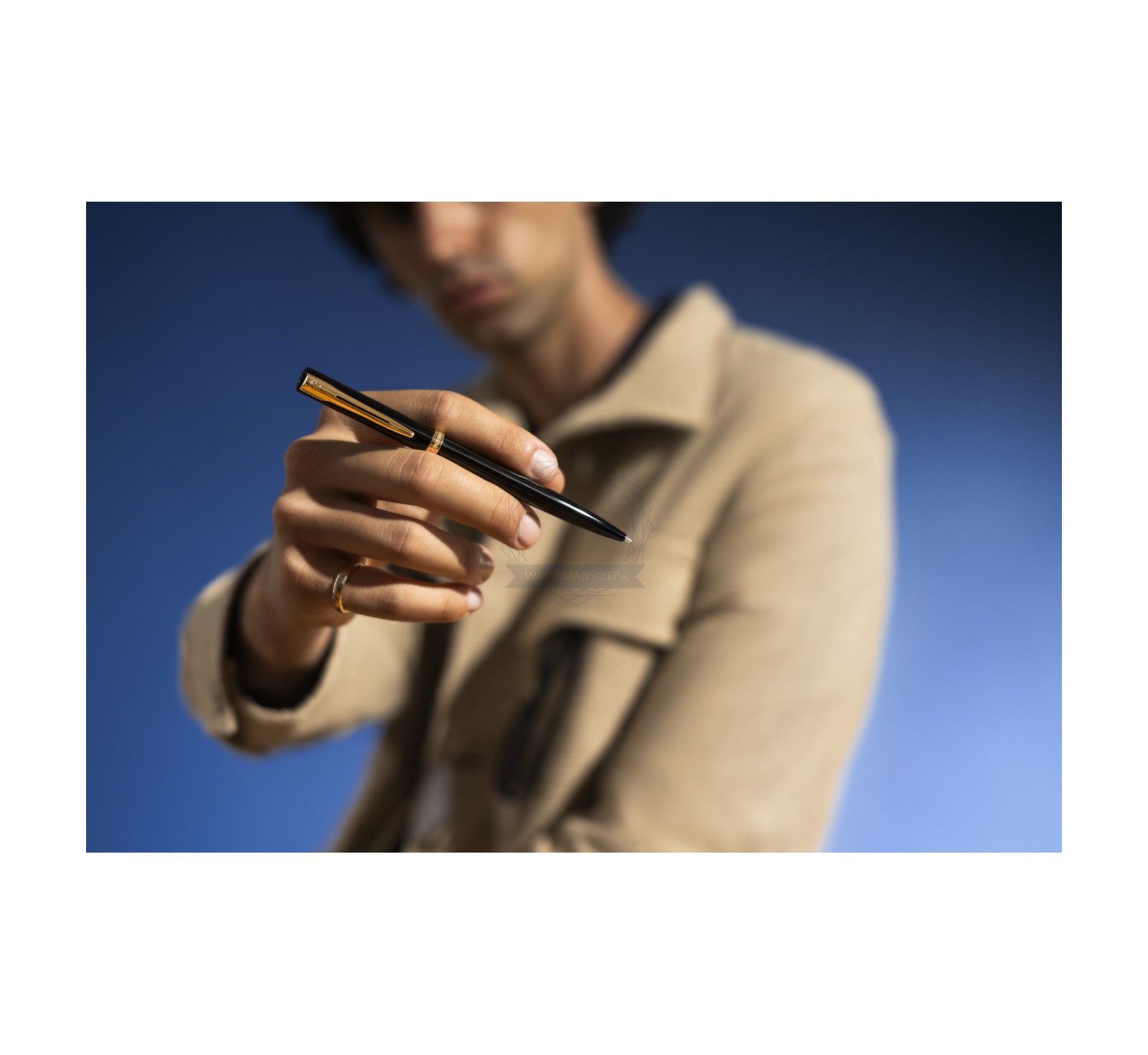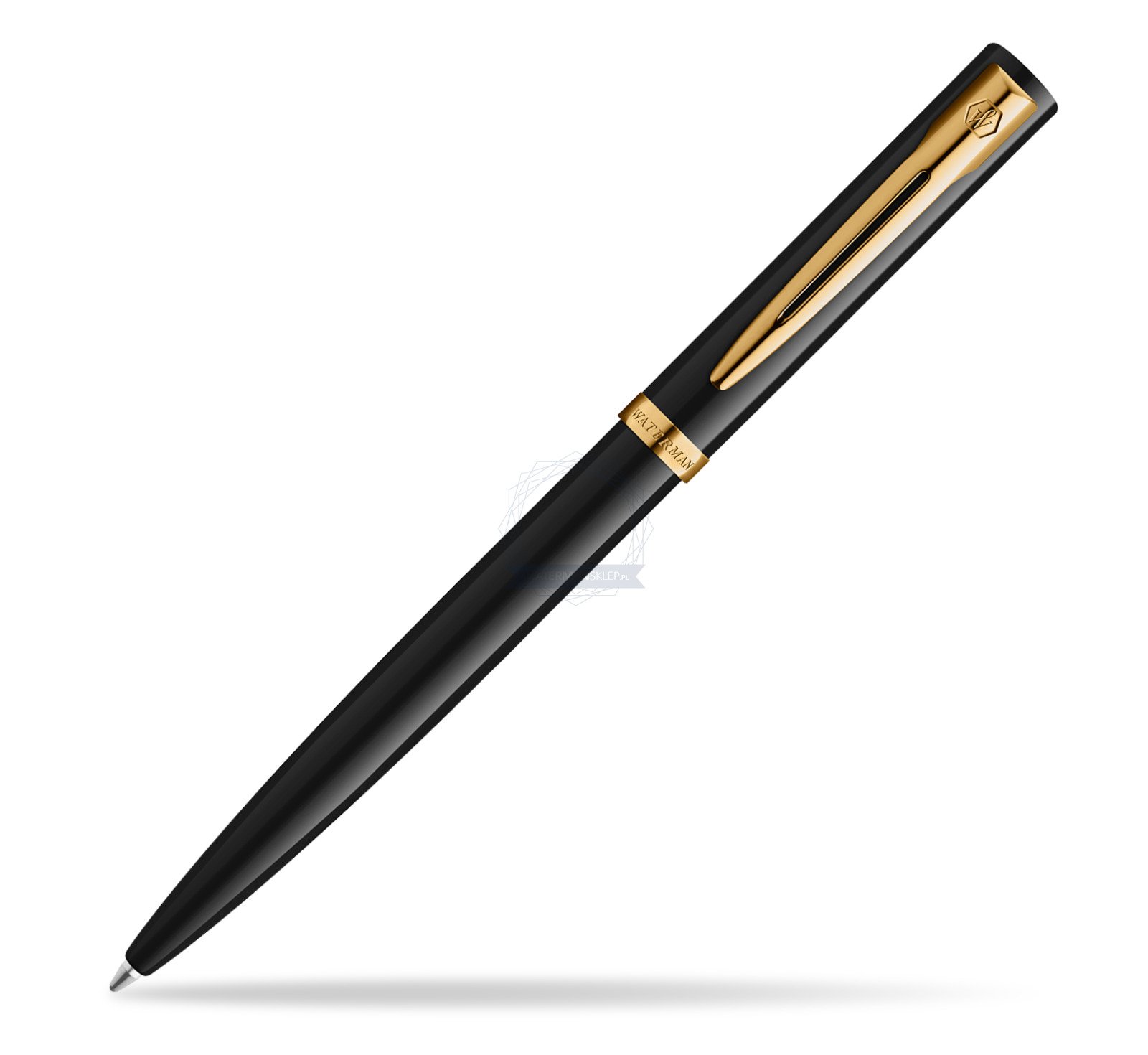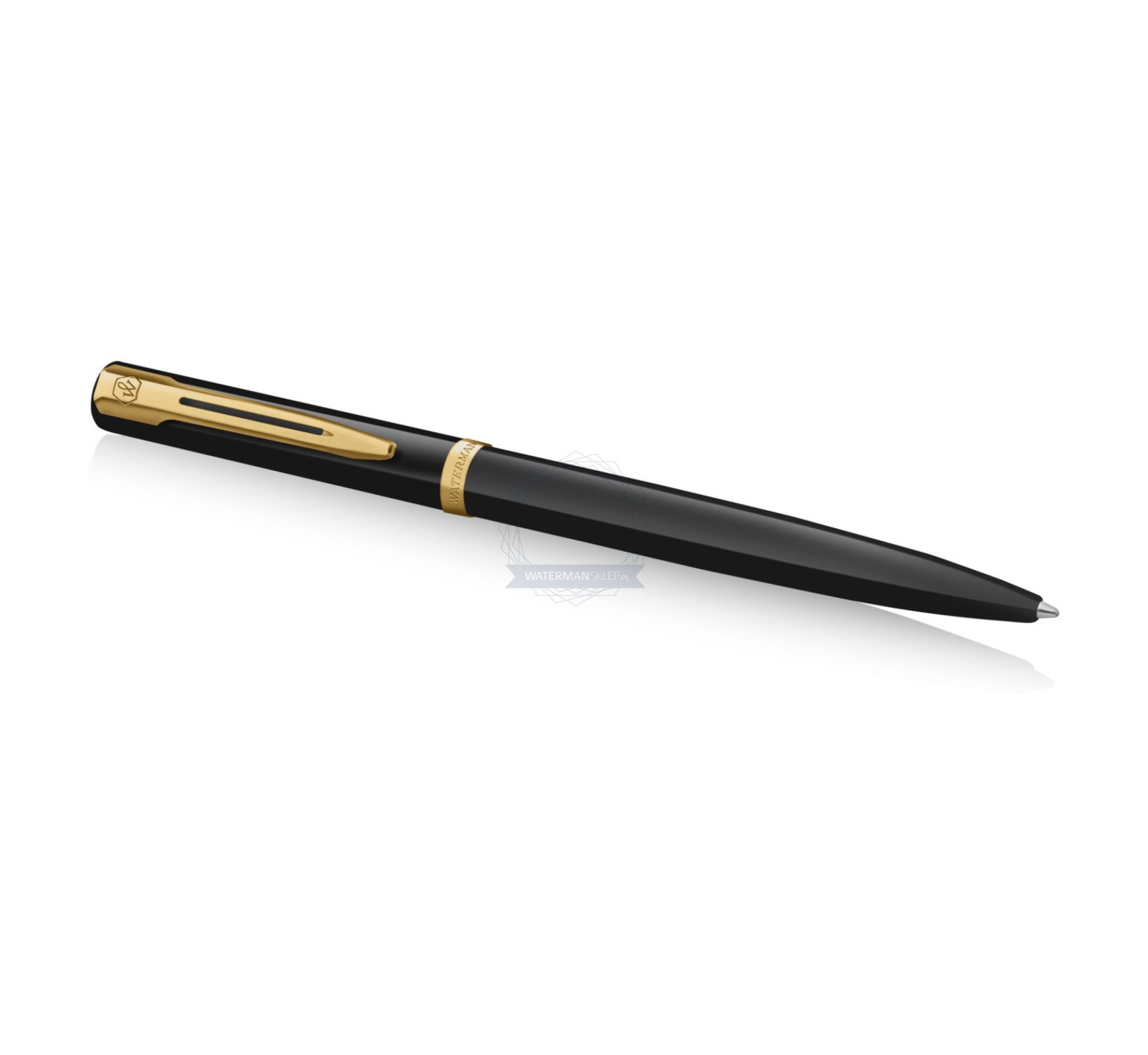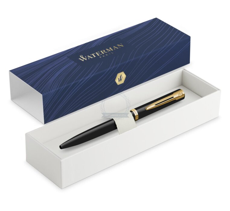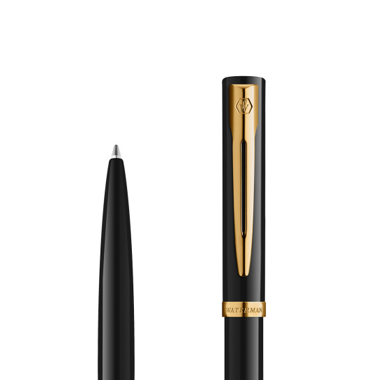Elegancka sylwetka z korpusem i nasadką wykończonymi błyszczącym czarnym lakierem. Charakterystyczny dla marki Waterman rozdwojony klips i szeroki, powlekany złotem pierścień na skuwce dopełniają stylistykę wyszukanym wdziękiem.