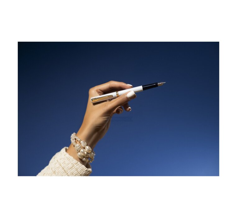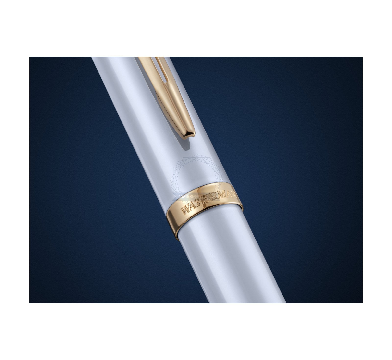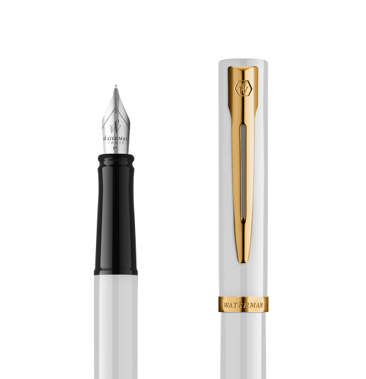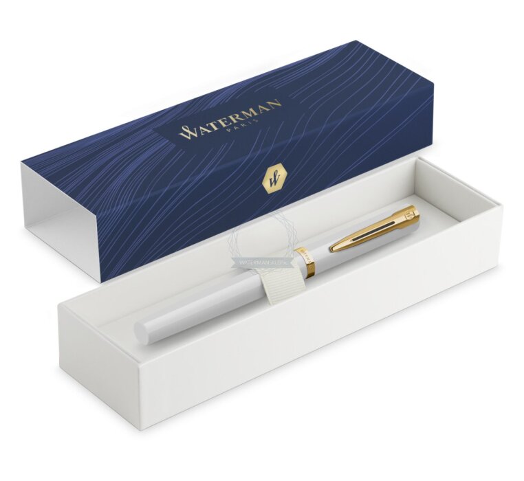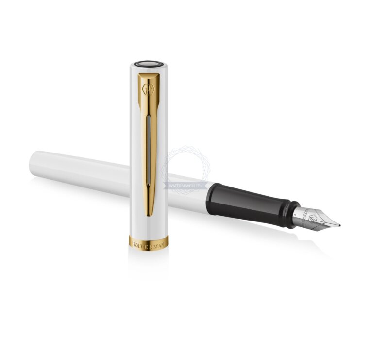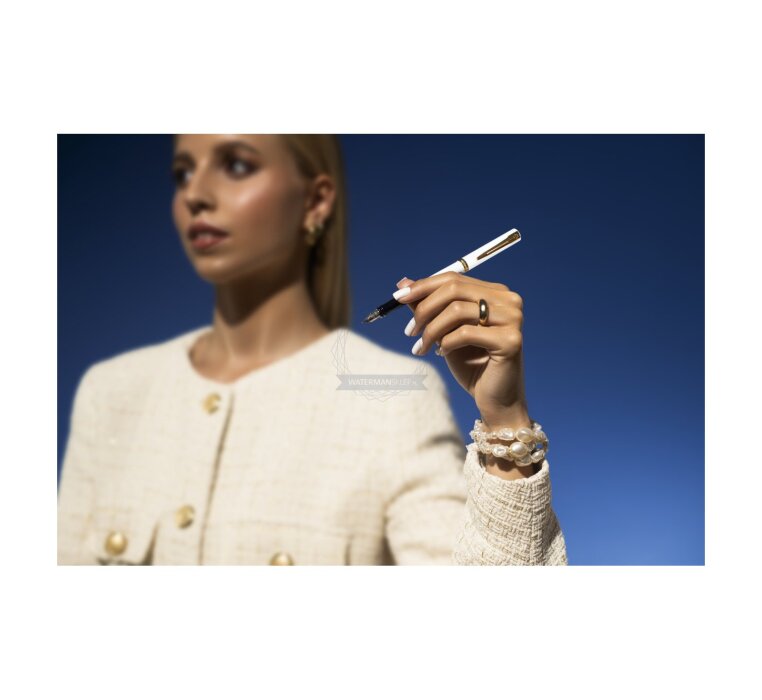 Elegancka sylwetka z korpusem i nasadką wykończonymi błyszczącym białym lakierem. Charakterystyczny dla marki Waterman rozdwojony klips i szeroki, powlekany złotem pierścień na skuwce dopełniają stylistykę wyszukanym wdziękiem.