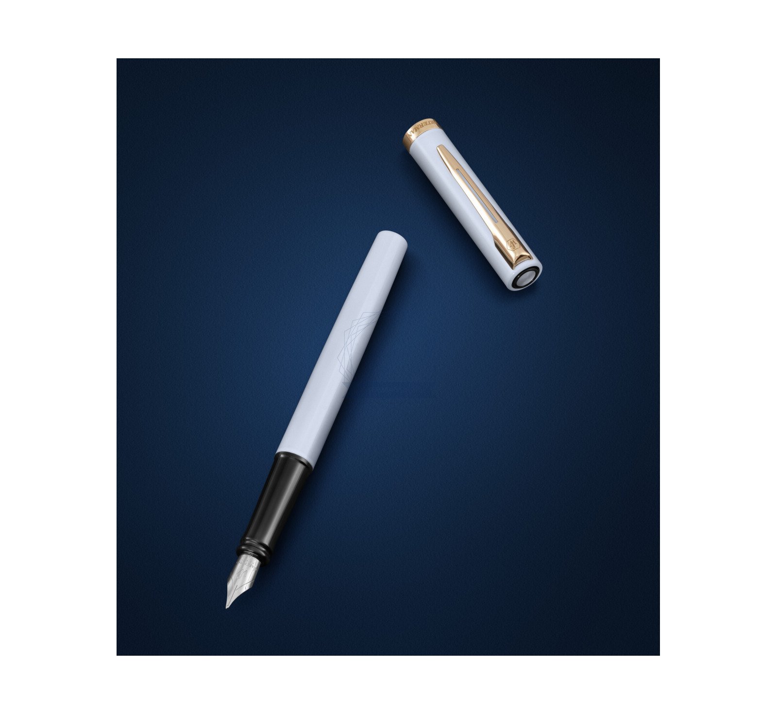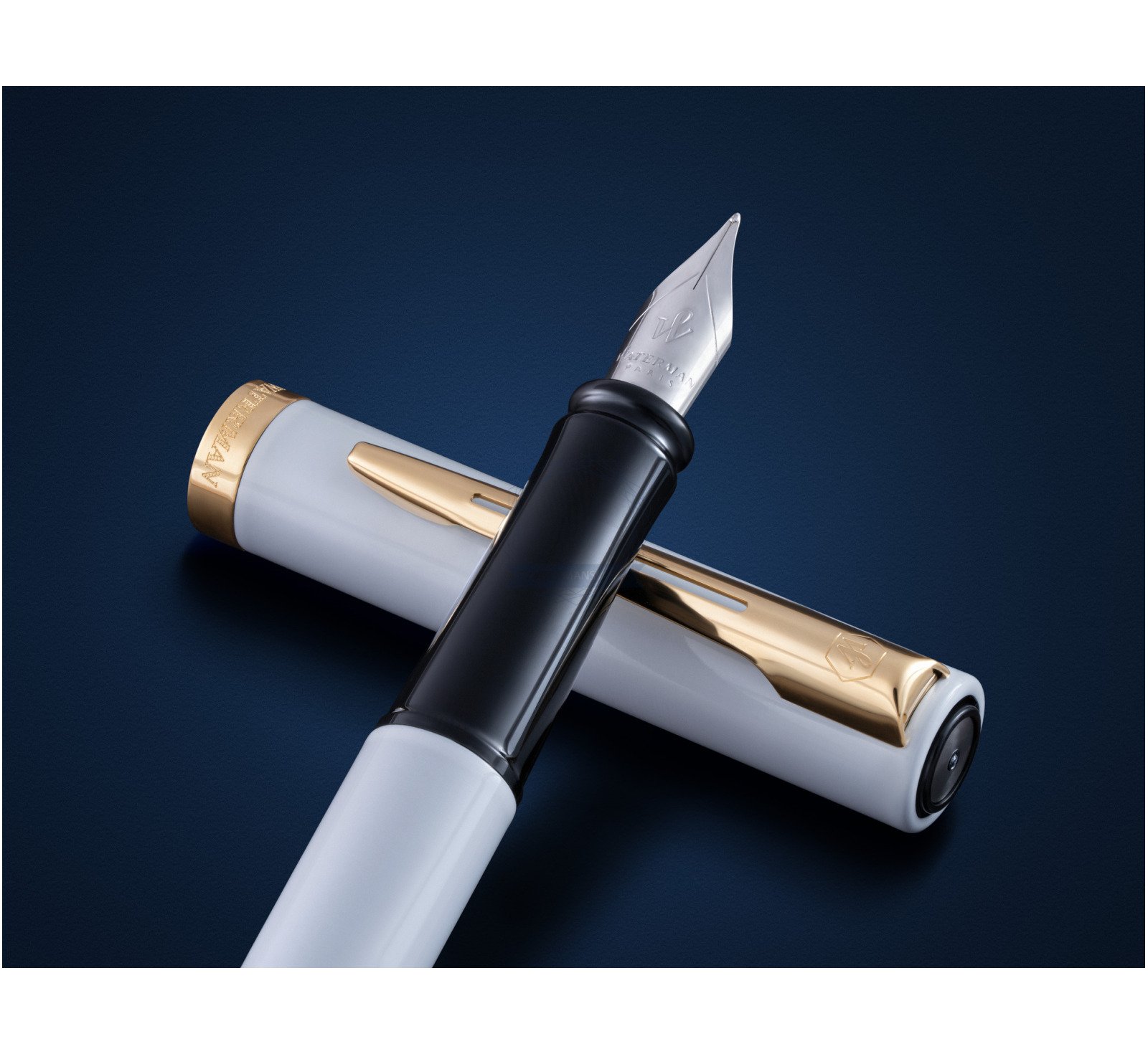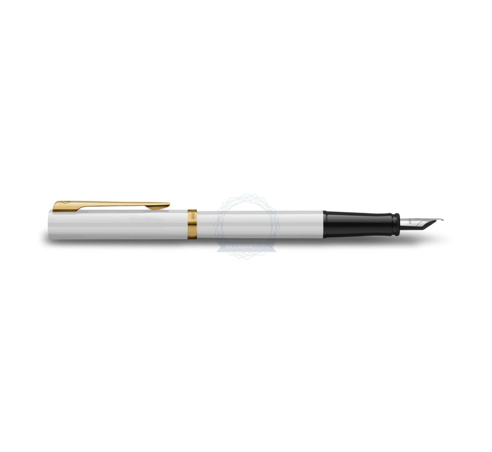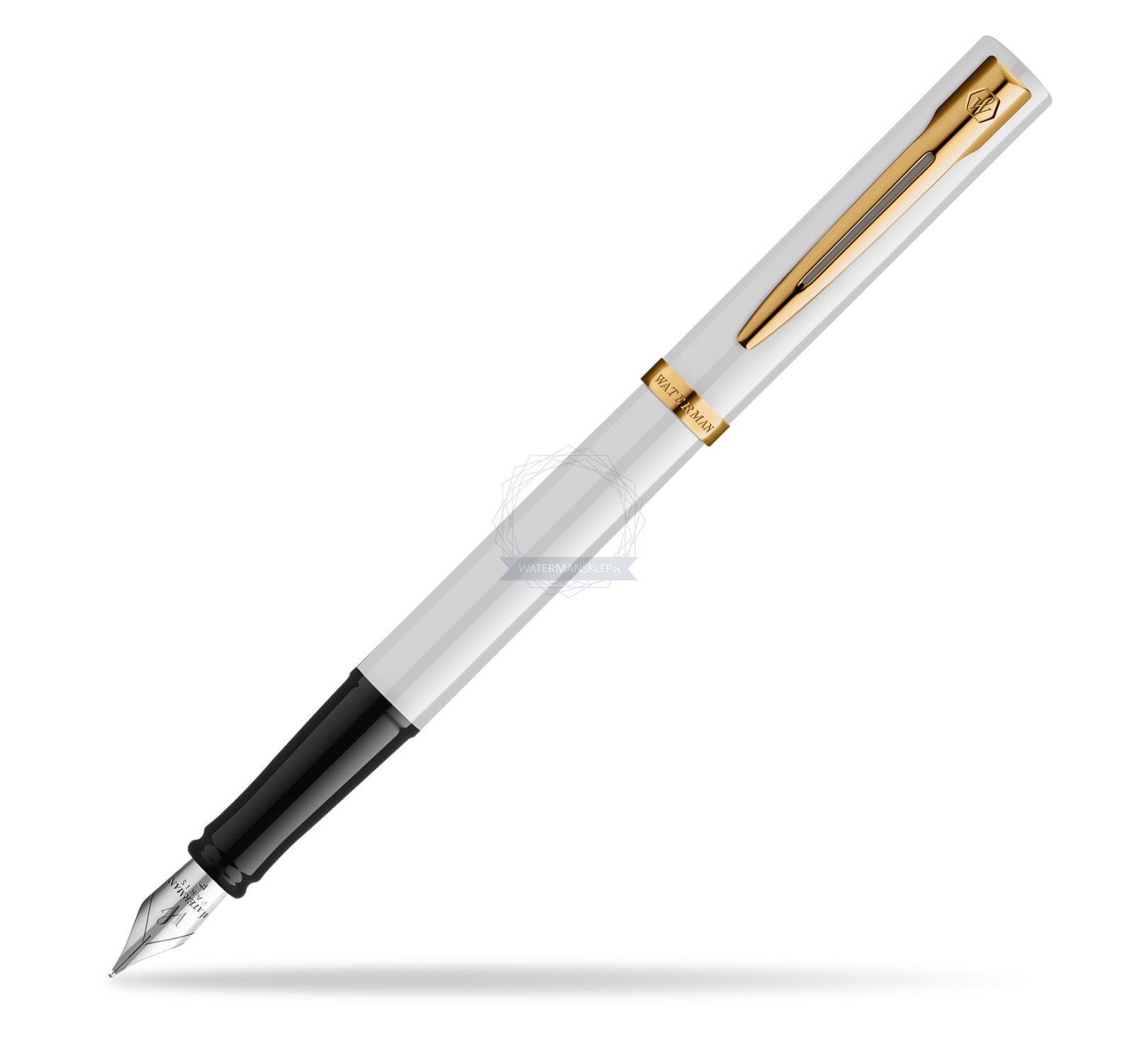 Elegancka sylwetka z korpusem i nasadką wykończonymi błyszczącym białym lakierem. Charakterystyczny dla marki Waterman rozdwojony klips i szeroki, powlekany złotem pierścień na skuwce dopełniają stylistykę wyszukanym wdziękiem.