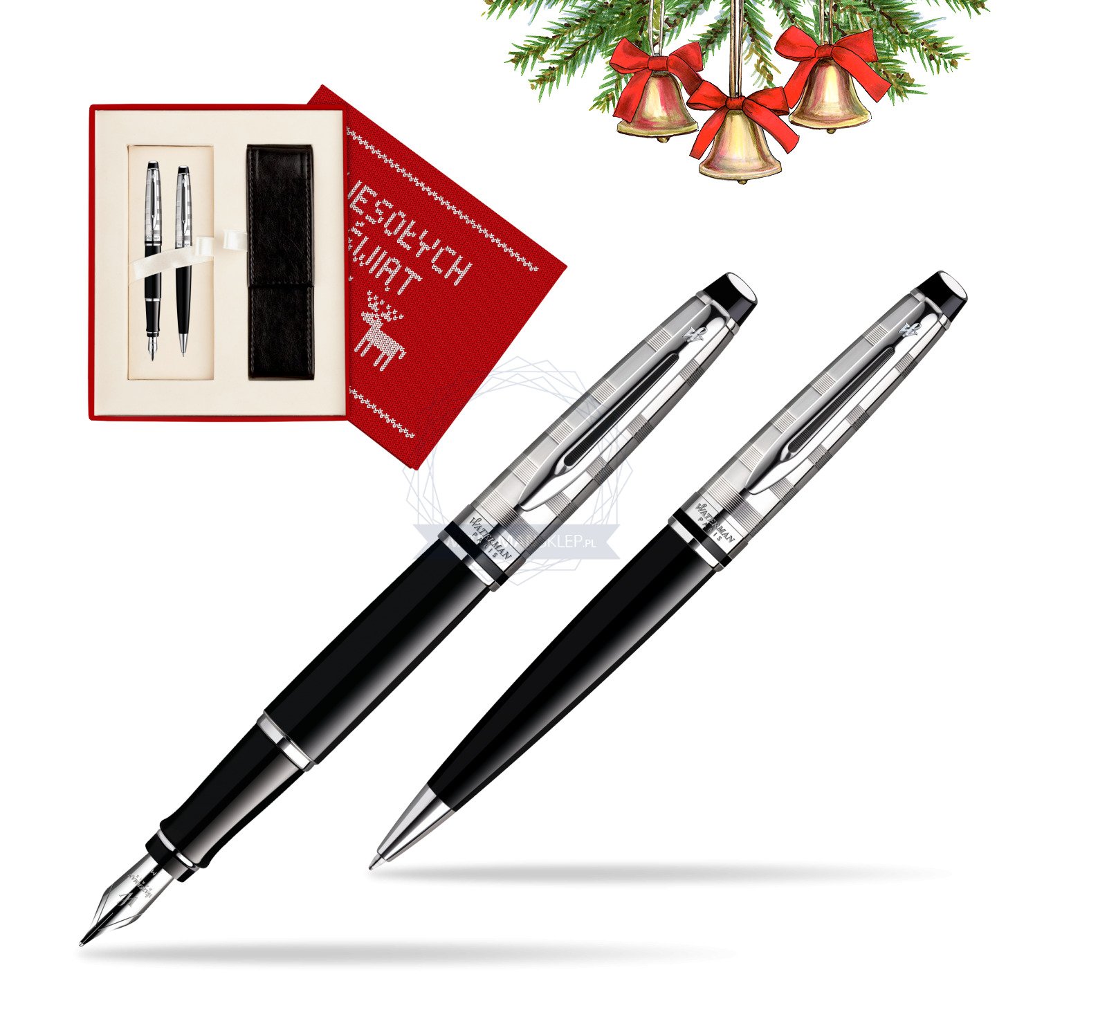 Zestaw prezentowy pióro wieczne + długopis Waterman Expert Deluxe Czarny CT w pudełku Wesołych Świąt czerwone